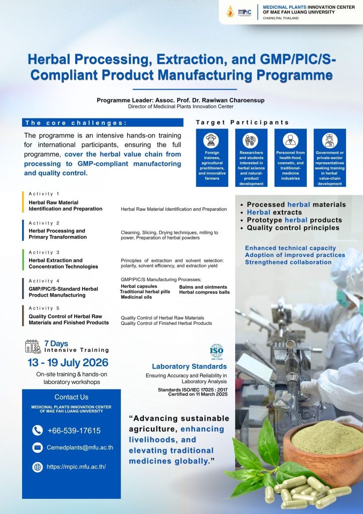 • Format: On-site training including laboratory workshops at Medicinal Plants Innovation Center, MFU Herbal Medicine Laboratory and MFU Herbal Processing Building